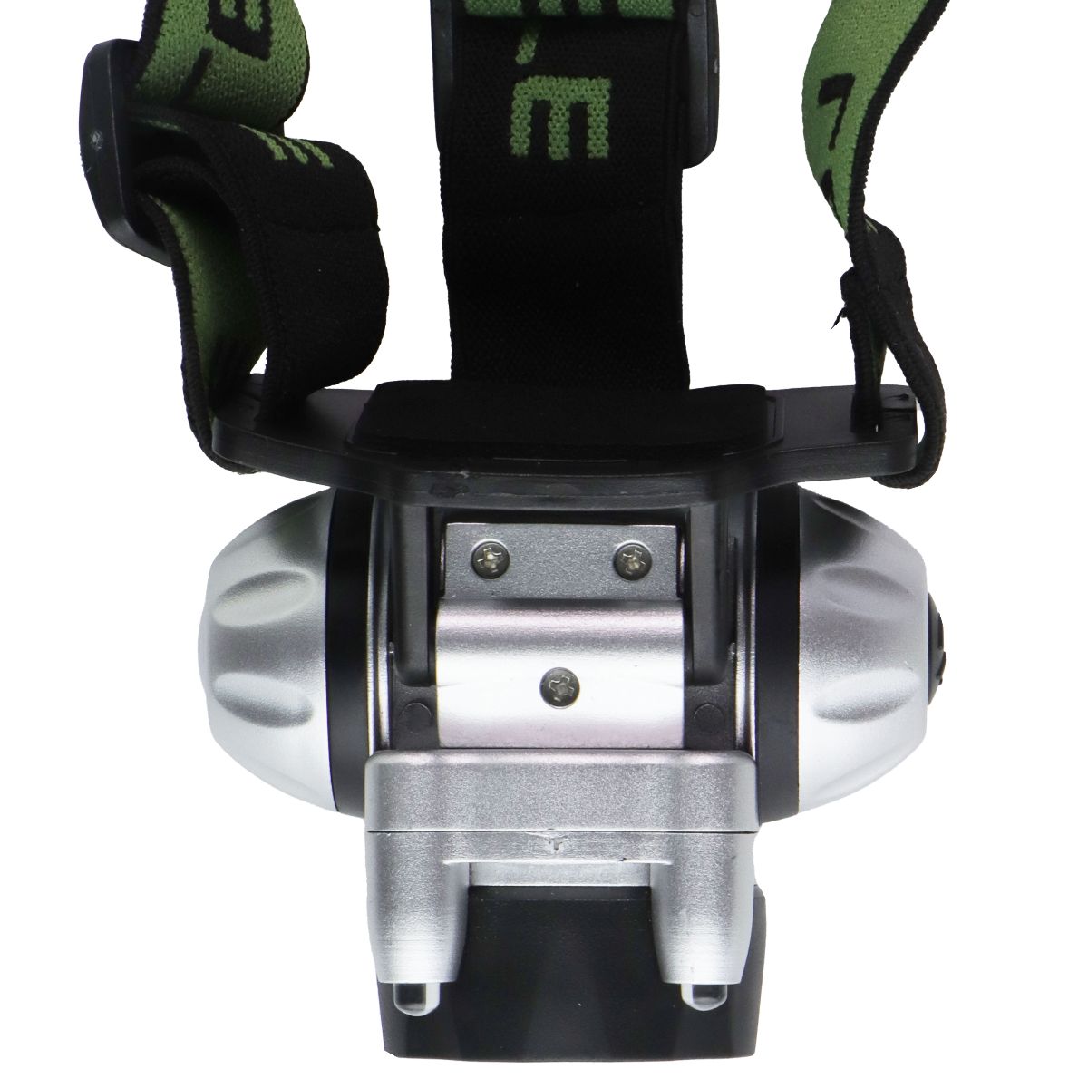 The Lepro Brand Llghtning EVER (LE) LED Headlamp Flashlight with Red Light for Outdoors. Silver finish with Black and Green Strap.