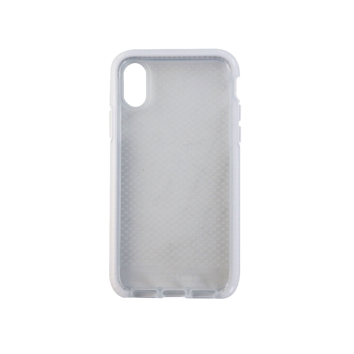 Tech21 Evo Check Case designed to be compatible with the Apple iPhone Xs and iPhone X. One piece easy access design with a clear finish and a white finish around the edges.