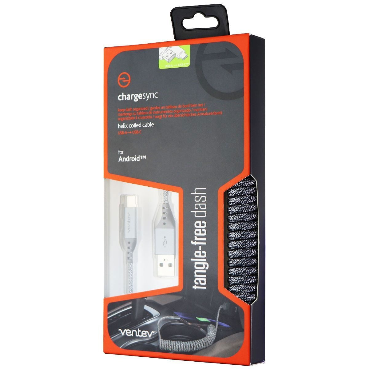 The Ventev ChargeSync 14-inch Helix Cloth Covered USB-C to USB Braided Cable. Gray color design.