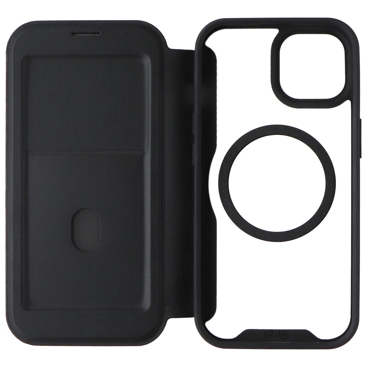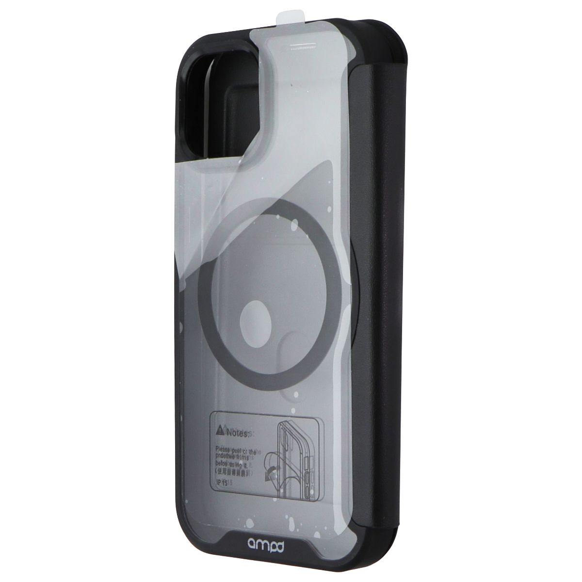 The Ampd TPU / Acrylic Flip Wallet Case for MagSafe for Apple iPhone 15. Clear and Black version.