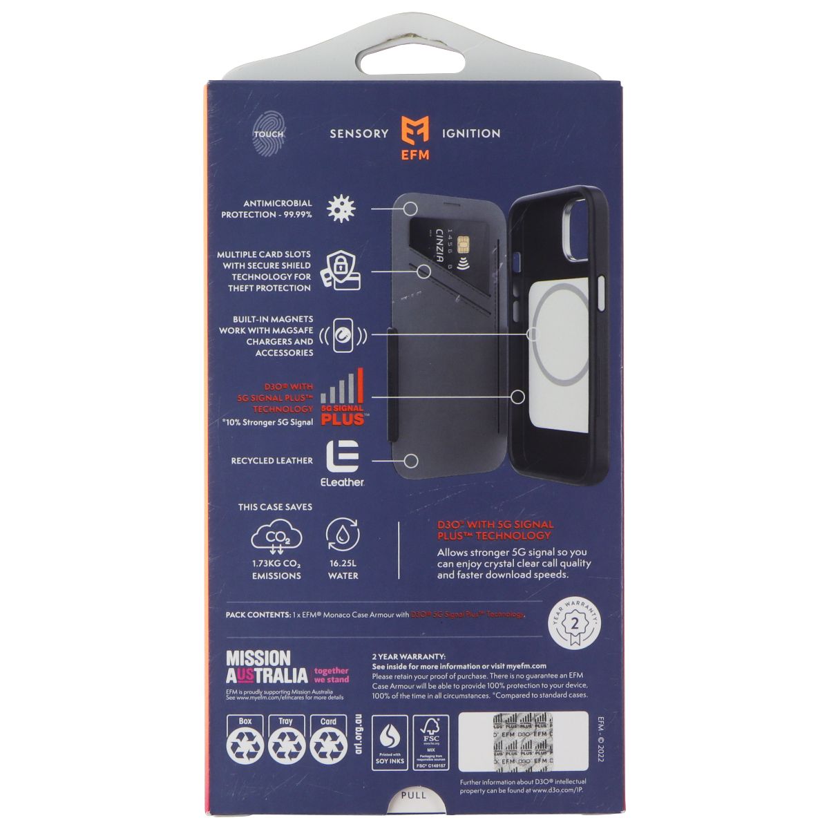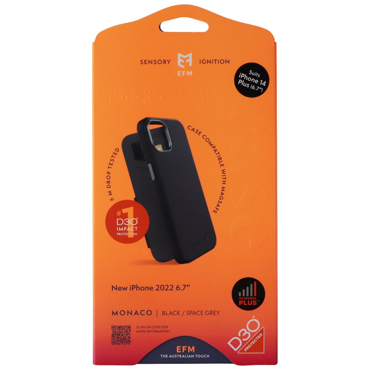 The EFM Monaco D3O Leather Wallet Case for MagSafe for iPhone 14 Plus. Black and Space Gray version.