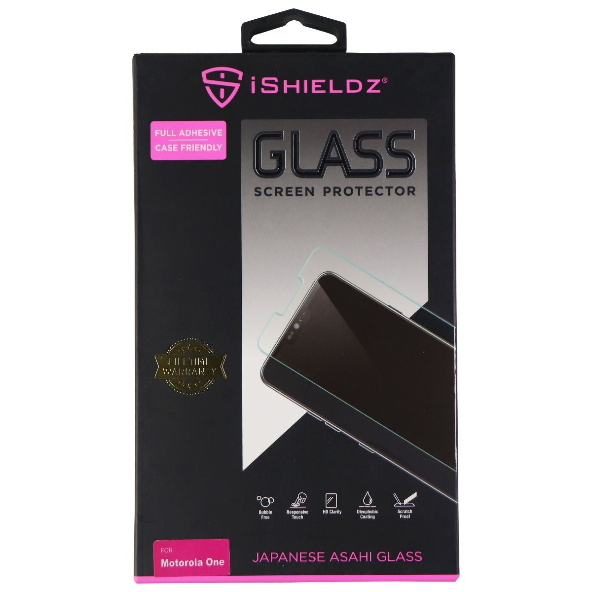 The iShieldz Asahi Tempered Glass Screen Protector for Motorola One Smartphones. Clear transparent glass.
