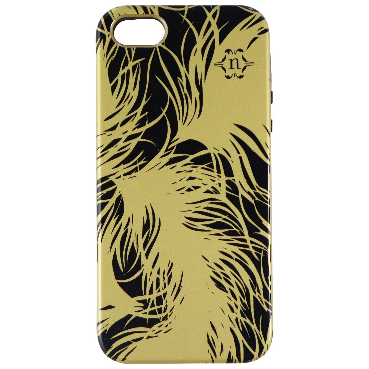 Isaac Mizrahi Dual Layer Case for Apple iPhone 5, 5S, and the new SE. - Black and gold feather pattern glossy finish with black inner Layer.