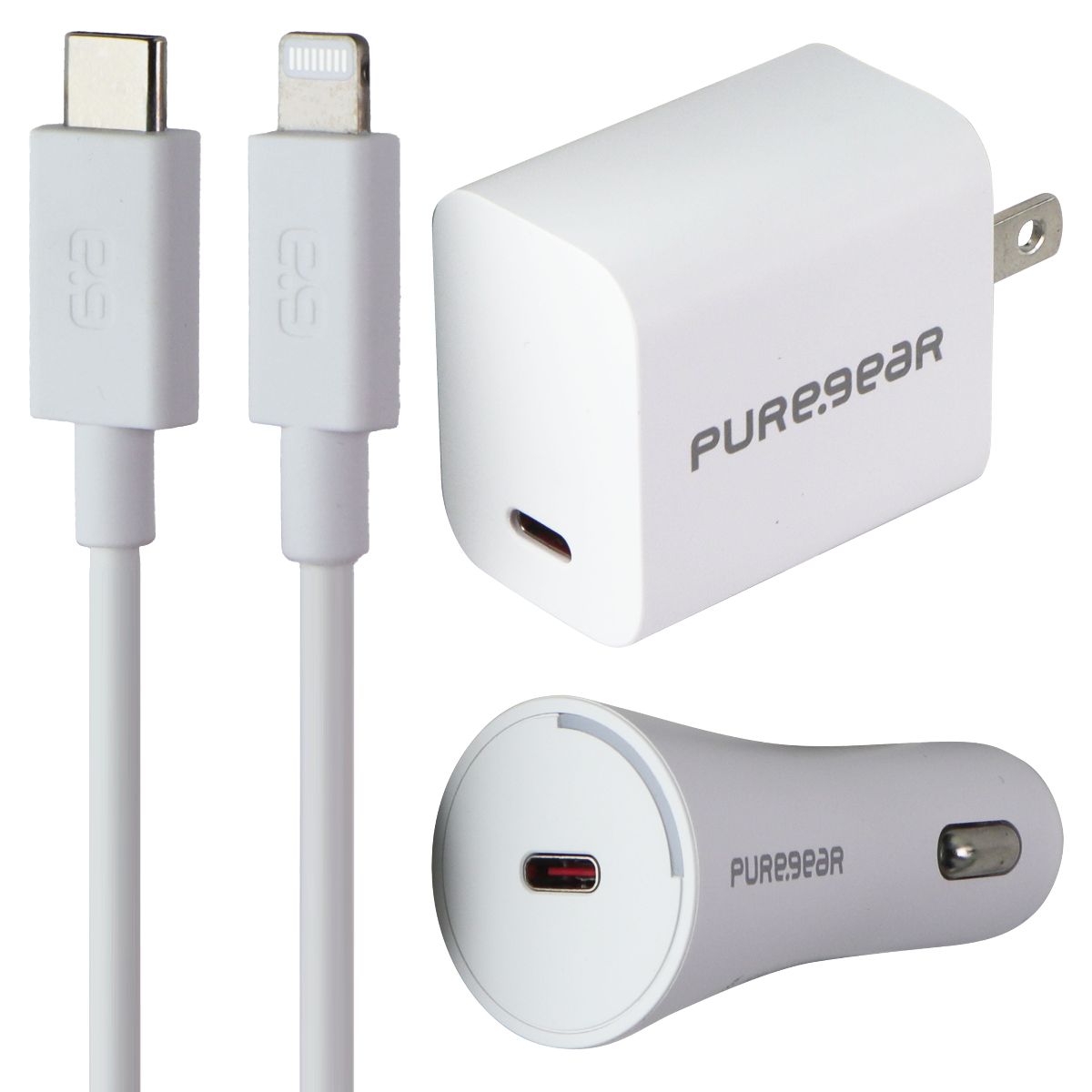 The PureGear Light Speed 20W USB-C Wall & Car Charger with USB-C to 8-Pin Cable. White Version.